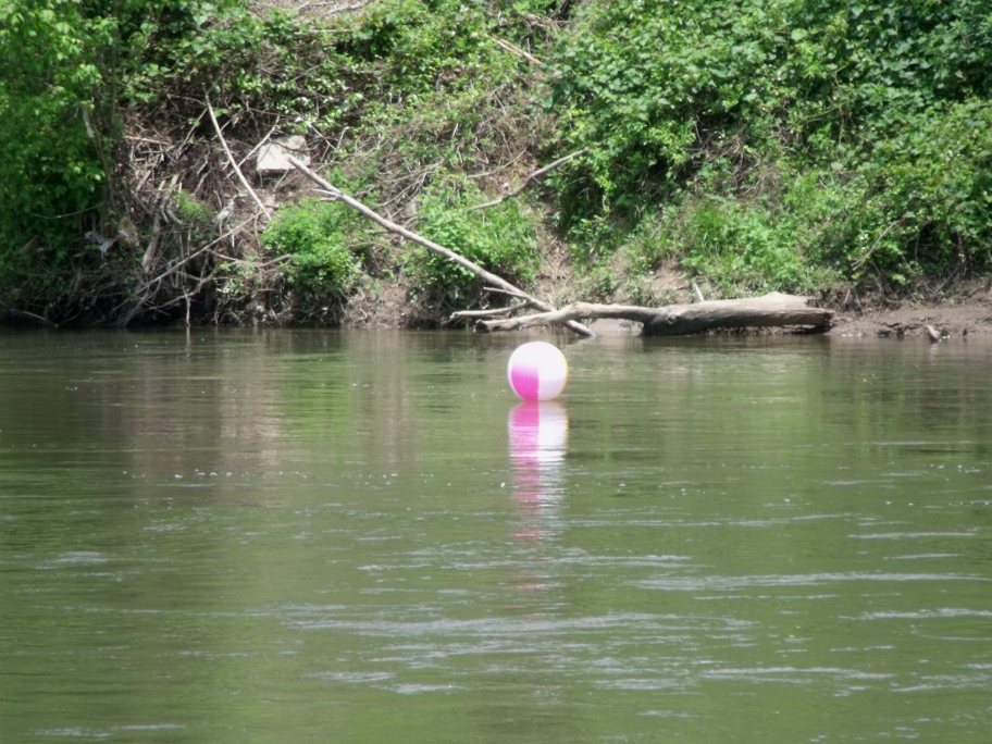 I eat lunch in Old Fort, and again get a good deal: $6 for lasagna, garlic bread and bottomless sweet tea. Back in Asheville, I stop by a riverside park. I see a few people on float trips, and one floating beach ball.
